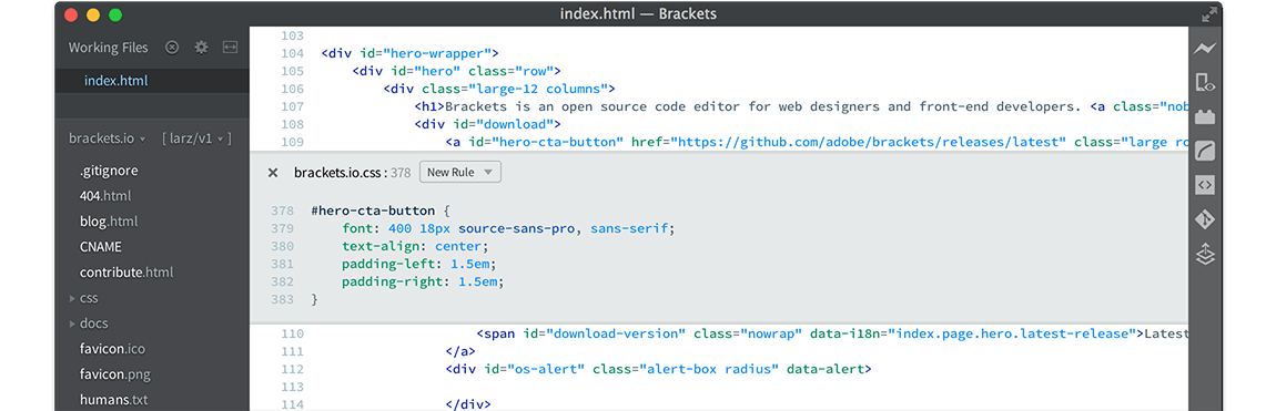 Tal como eles, podemos citar o Brackets. O editor de texto da Adobe foi lançado em 2014 e chamou muita atenção quando anunciado. Não apenas por ser de uma das principais empresas de mídia que existe (Illustrator, Photoshop e Dreamweaver) mas também por ter ferramentas muito úteis capazes, por exemplo, de ler arquivos .PSD e entregar um código para aquele layout.